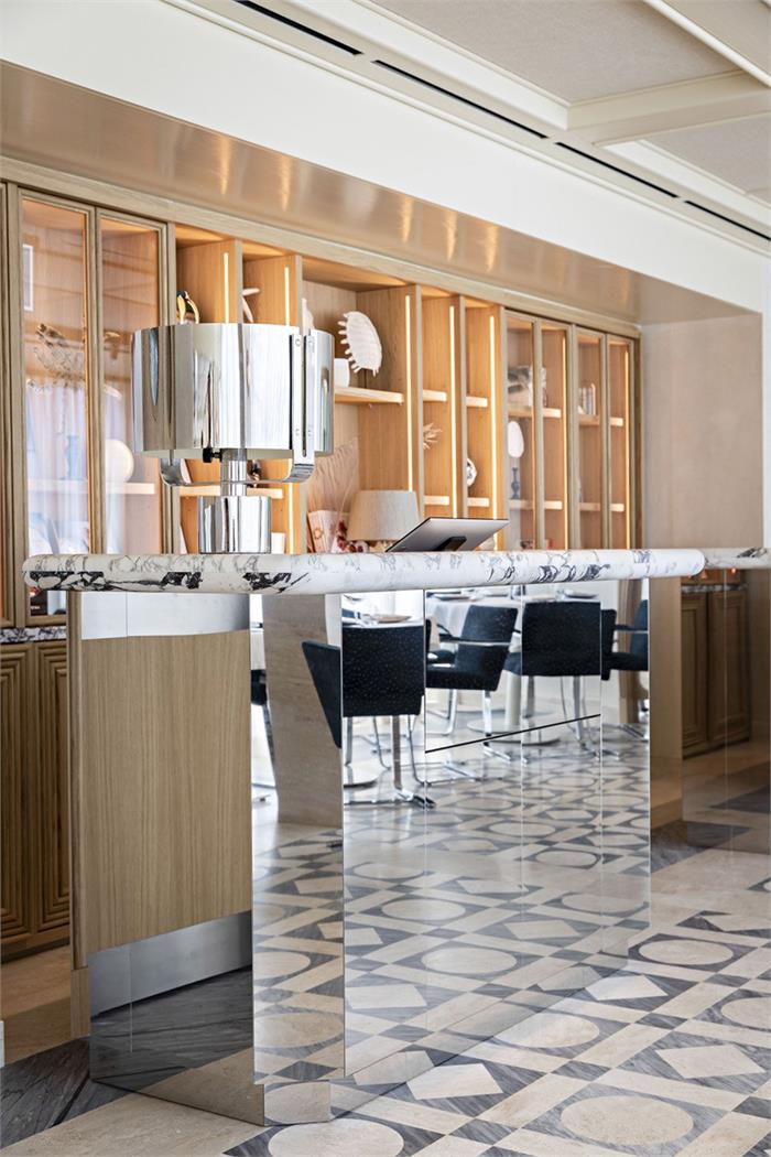 Il banco bar è una maestosa struttura semi-ellittica con un piano di appoggio in marmo breccia viola spesso 40mm all'interno e 80mm all'esterno. La parte verticale esterna è rivestita in lamiera di acciaio lucido specchiante con un effetto nuvolato che sfuma gradualmente verso l'alto, mentre al centro del banco si trova una colonna rivestita in specchio anticato grigio damasco disposto a mosaico. Per completare l'aspetto elegante del bancone, sono state installate delle lampade a forma di fungo, interamente realizzate in marmo breccia viola secondo le nostre specifiche ingegneristiche.